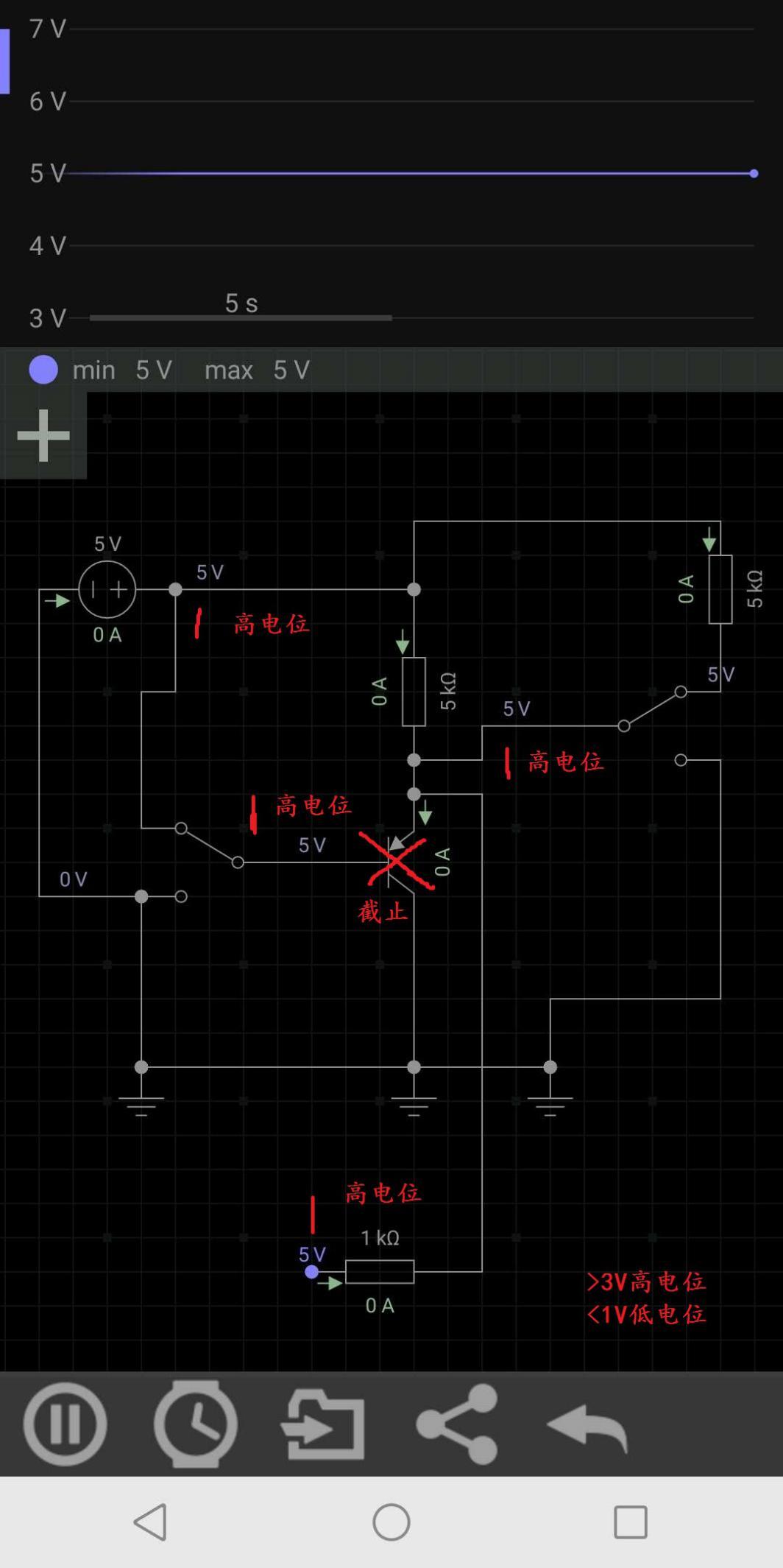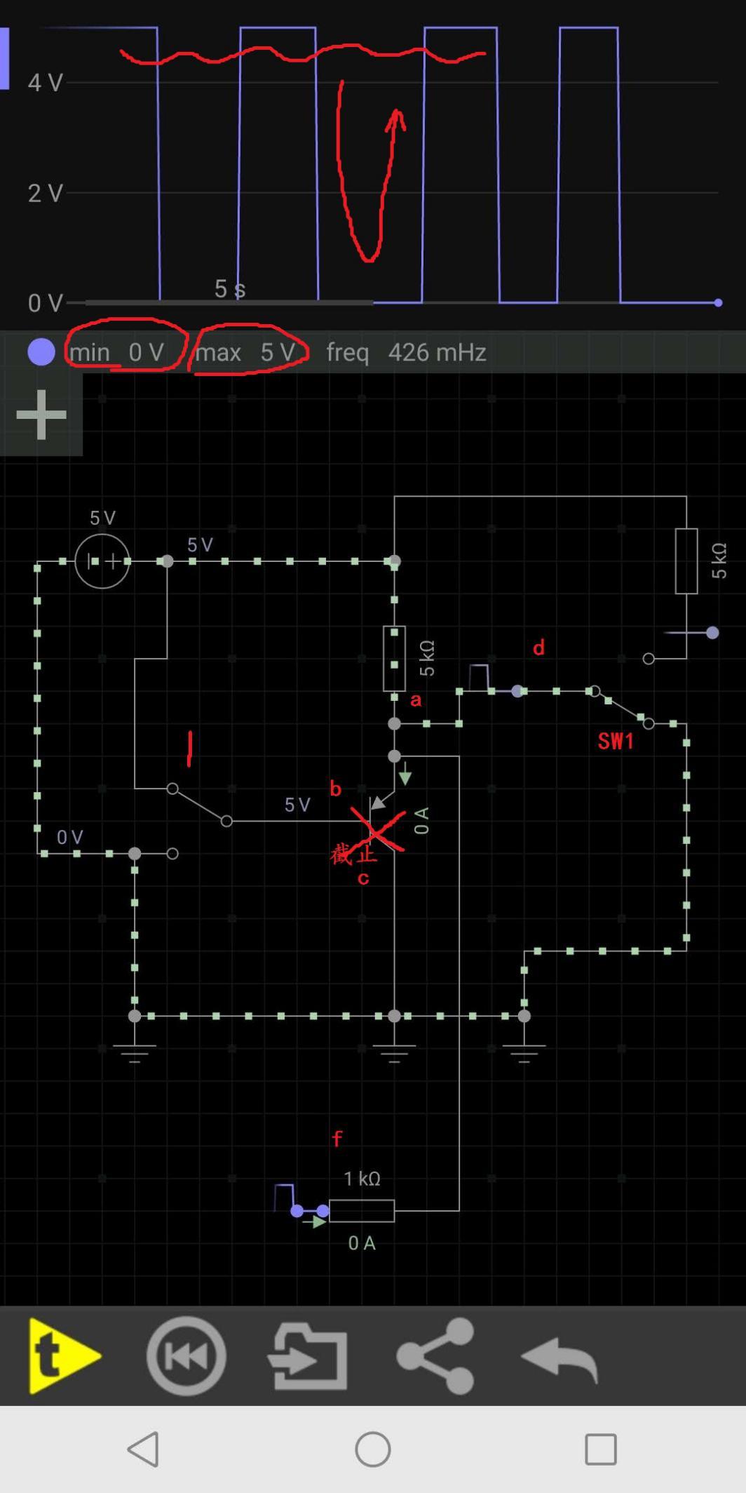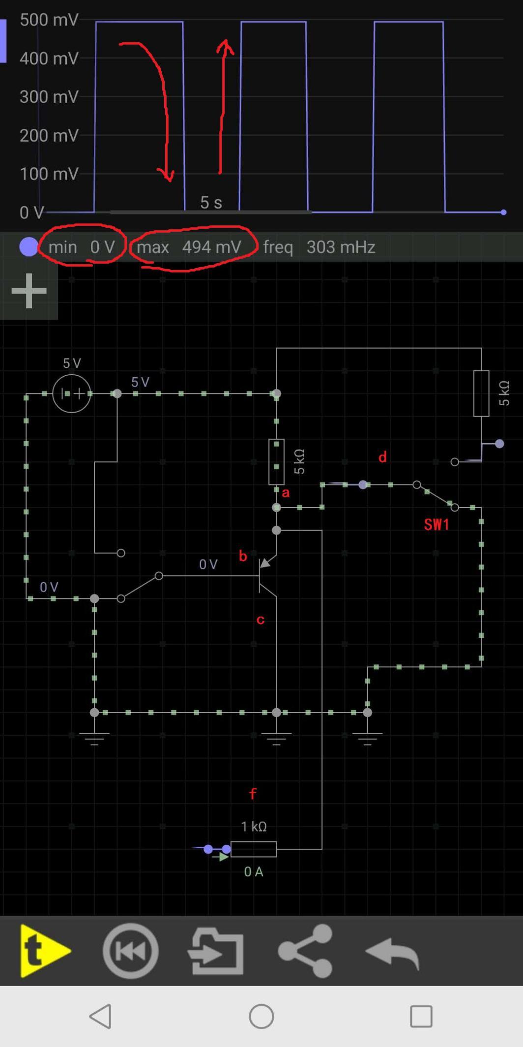此时可以直观的看出,上方的波形已经从几毫伏的变化,变成了现在的0到5V,当SW1切换到5V高电位,由于三极管截止了,所以a点就是5V高电位,f读取到的就是5V高于3V,于是控制器认为输入的是一个高电位,当SW1切换到0V低电位,还是因为三极管截止的原因,a点相当于通过SW1直接与负极相连,所以a点就是0V低电位,f读取到的就是0V低于1V,于是控制器就认为输入的是一个低电位,这样外部的信号与控制器读取的信号就一致了。