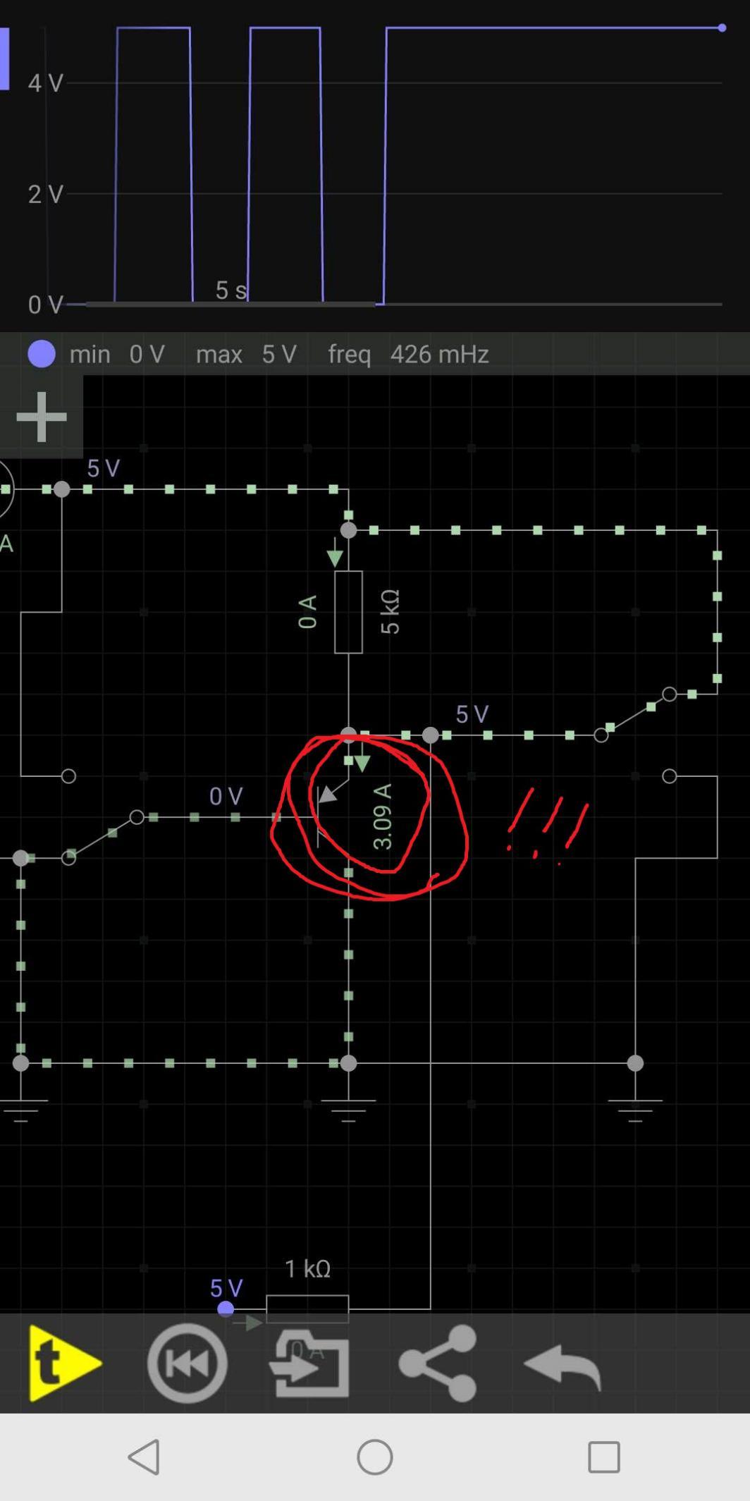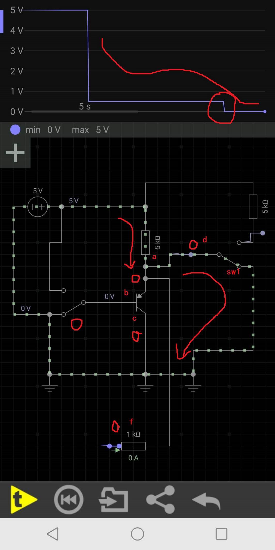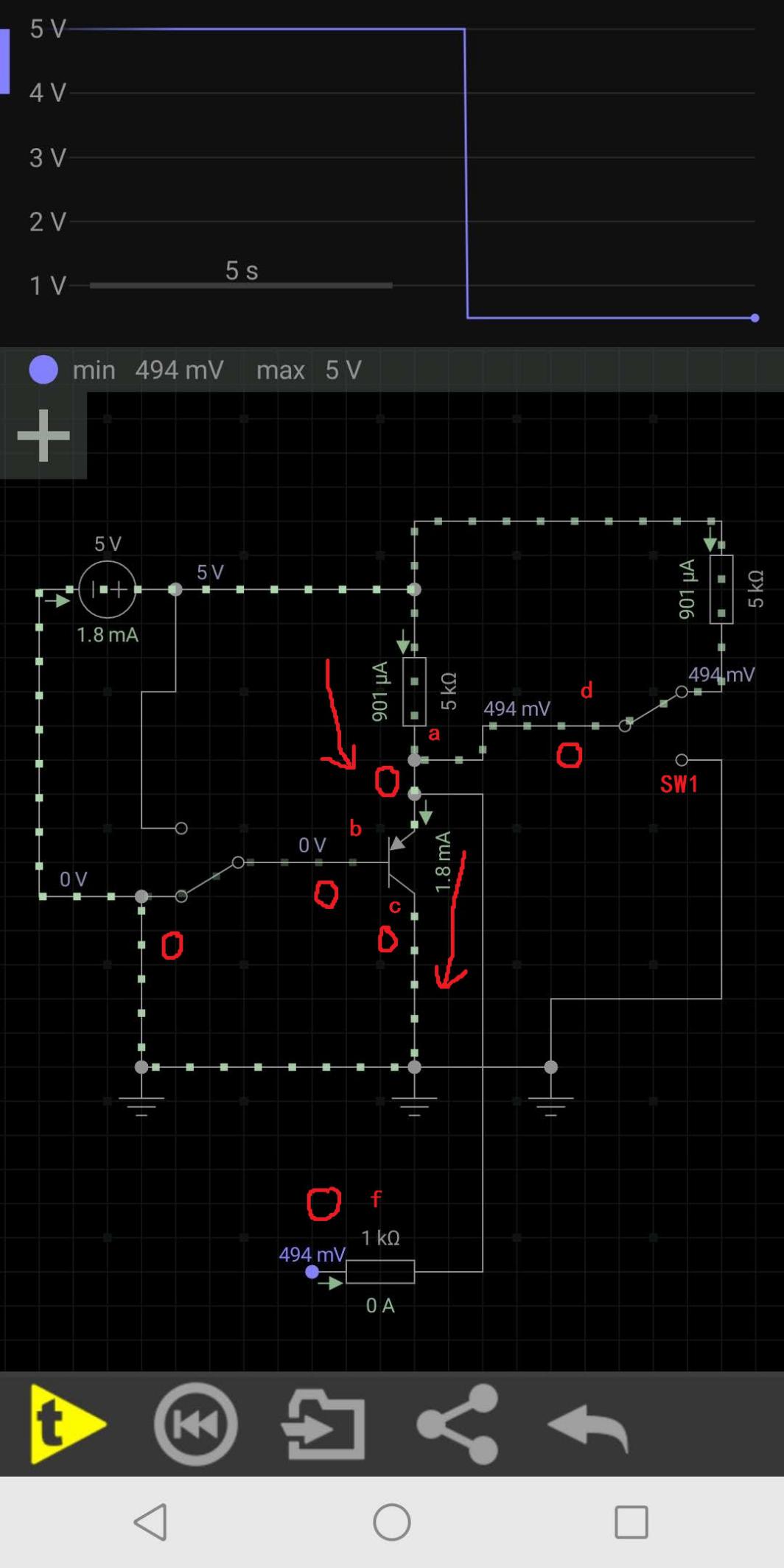此时可以直观的看出,上方的波形已经从几毫伏的变化,变成了现在的0到5V,当SW1切换到5V高电位,由于三极管截止了,所以a点就是5V高电位,f读取到的就是5V高于3V,于是控制器认为输入的是一个高电位,当SW1切换到0V低电位,还是因为三极管截止的原因,a点相当于通过SW1直接与负极相连,所以a点就是0V低电位,f读取到的就是0V低于1V,于是控制器就认为输入的是一个低电位,这样外部的信号与控制器读取的信号就一致了。