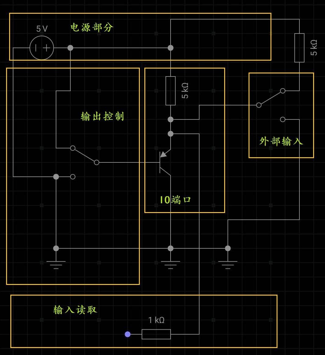 电路尽可能的与原理图一致,我们分为了电源部分、输入输出部分、端口部分、和外部电路,首先我们来说下当输出部分输出高电位时,电路的状态。