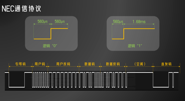 560微秒载波加上560微秒空闲代表逻辑“0”,560微秒载波加上1.68毫秒空闲代表逻辑“1”。