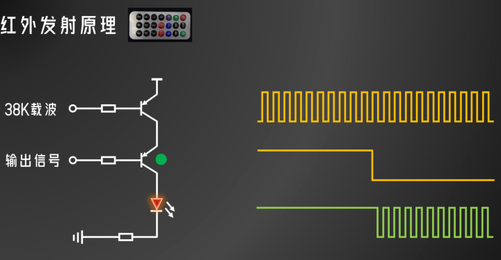 当输出端信号为低电平时,此时三极管导通,38K载波信号得到释放,输出信号被调制为38K载波信号,通过红外管发送。
