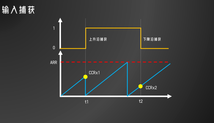 此时计数器循环计数,直到信号在t2时刻遇到下降沿时,记录此时数值存入CCRx2,这样就可以根据t1到t2这段时间经历了多少个ARR,再加上CCRx2,