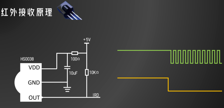 当接收管监测到有38K的红外信号时,就会在OUT引脚输出低电平;当没有38K红外信号时,OUT引脚就输出高电平。