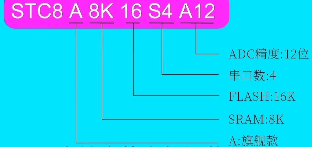 我们以STC8A8K16S4A12为例,A代表旗舰款,内存容量为8K字节,闪存容量为16K字节,有4个独立串口,ADC精度为12位,8系列单片机拥有高精度的内部振荡器。