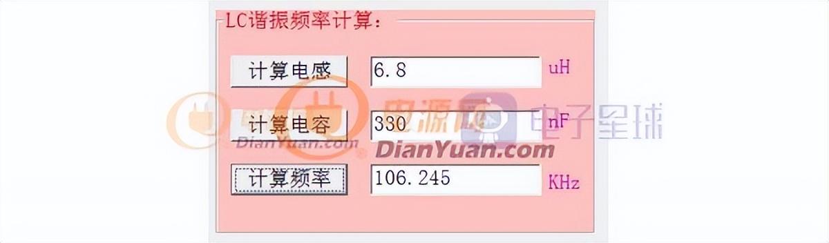 本无线电源使用的谐振电容为330nF,线圈电感量为6.8uH,所以谐振频率为106kHz,频率计算如下图发示: