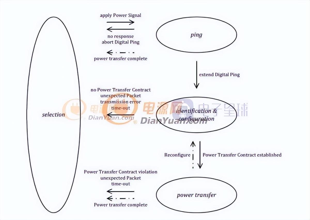 ▲放上接收线圈时,在线圈没有工作电流时,消耗功率为:1W之间跳变。这个数据大家注意下,在手机充满时就是这种情况。1W的功耗还是相当高的,所以这就需要通信协议的支持。这个协议主要是手机端告诉无线充发射端,我充满了,不要在1W工作了,你可以回到待机状态了。如下图所示:
