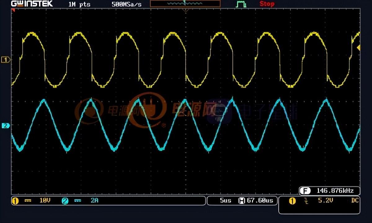 ▲图示为空载时线圈两端的电压电流波形,频率为177kHz,幅度为10V左右,电流幅度为2A左右。