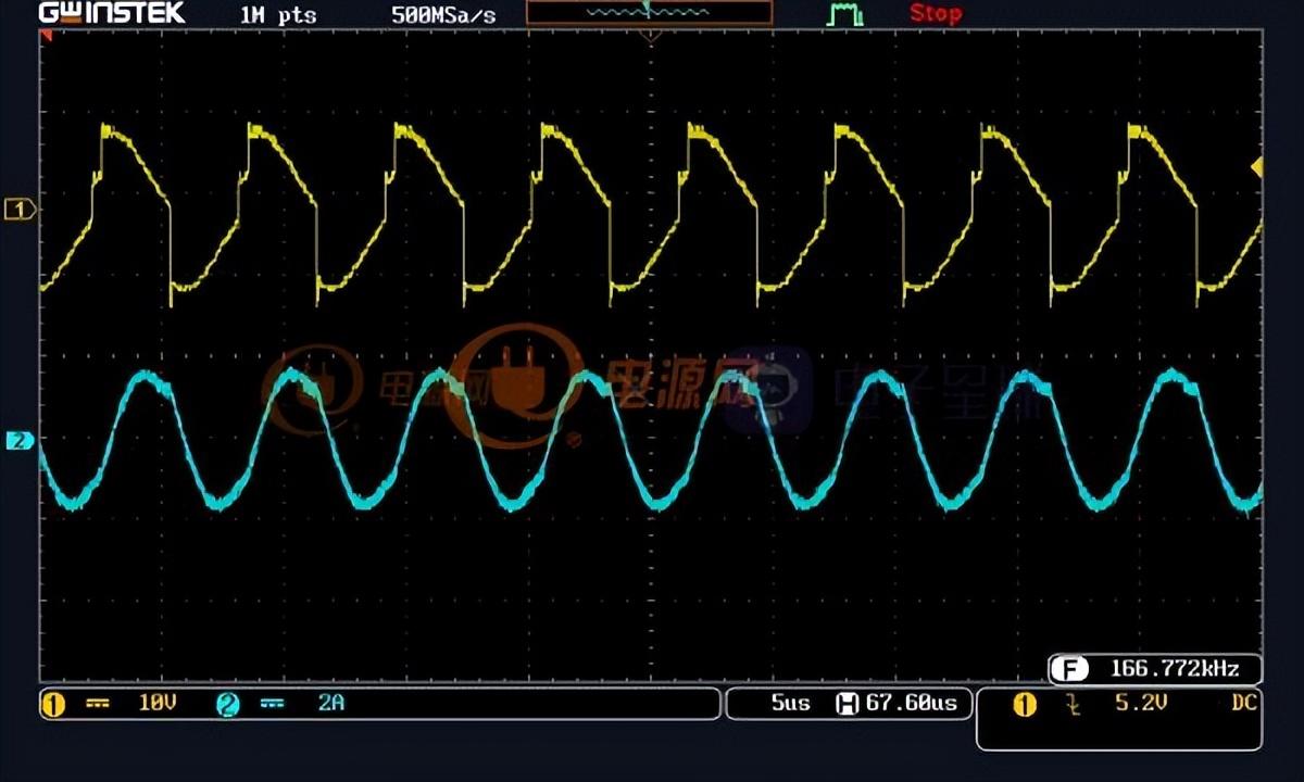 ▲图示为有接收线圈时,为电子负载提供600mA电流时,发射线圈两端的电压电流波形,频率为166kHz,幅度为10V左右,电流幅度为2A左右。