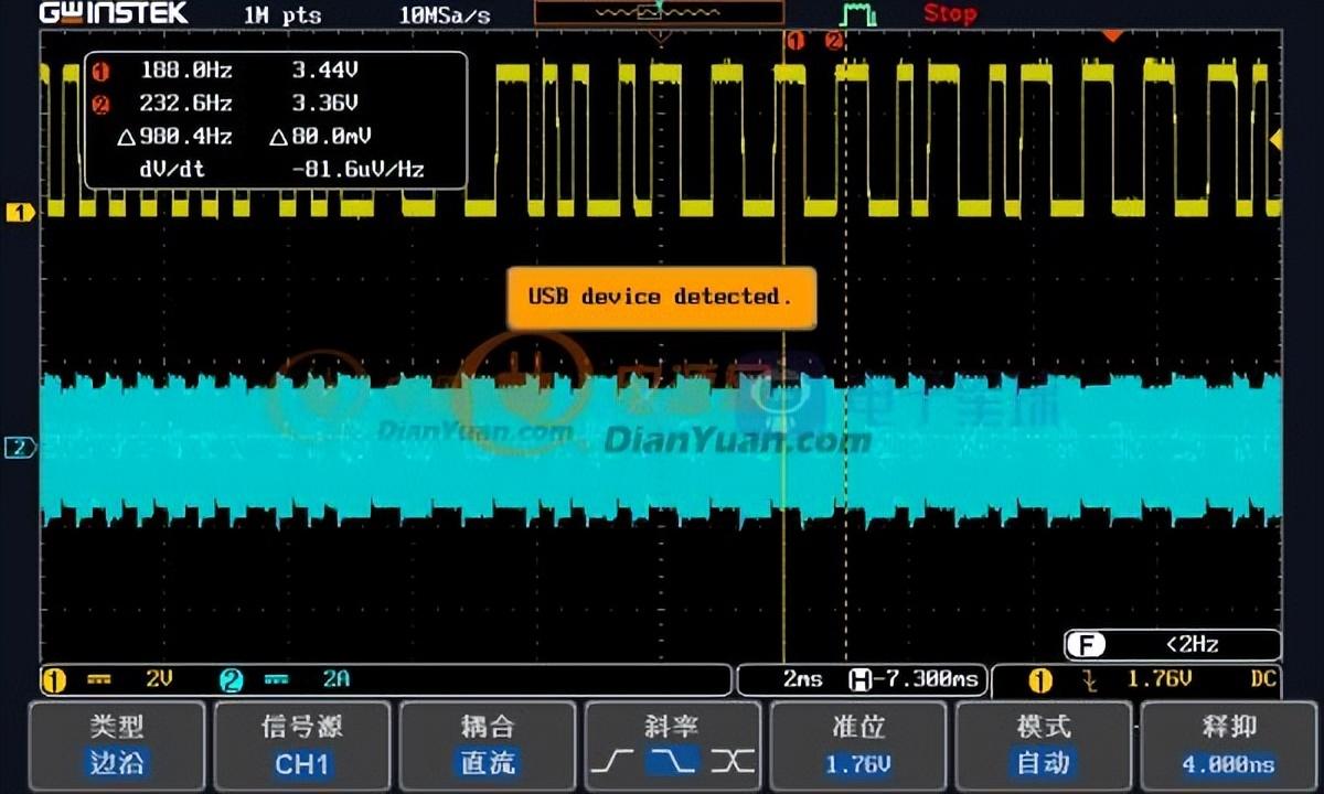 ▲通过读取发射线圈的电压电流,可以看出线圈被调制了,调制方式为ASK,编码方式为差分双相编码,通信波特率为2kHz。