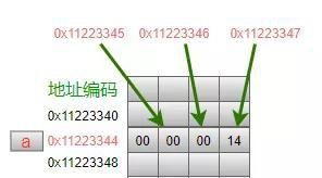 在图示中,使用十六进制来表示,十进制数值 20转成 16进制就是:0x00000014,所以从开始地址依次存放 0x00、0x00、0x00、0x14这 4个字节(存储顺序涉及到大小端的问题,不影响文本理解)。