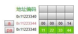 另外,0x11223344,0x11223345,0x11223346,0x11223347这连续的、从低地址到高地址的 4个字节用来存储变量 a的数值 20。