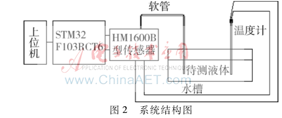 测量过程:将一根软管一端与压力传感器连接,另一端放入水槽中,此时管内的气压会随着容器中液位的增加或减少而产生变化,由传感器采集气压的数据并经温度补偿等处理后转化为线性规律的电压信号输出,电压信号由STM32单片机的12位ADC进行采集并对采集到的信号进行进一步处理,将其转换为水位值在液晶显示屏上显示,同时将处理好的数据通过串口发送到上位机,得到水位变化的曲线图,并可实现历史水位数据的查询。温度补偿已包含在压力传感器内部,因此不做详细介绍。系统结构如图2,系统原理如图3。