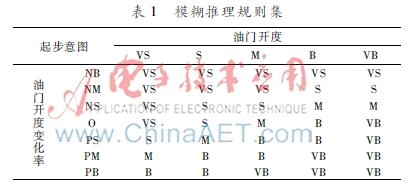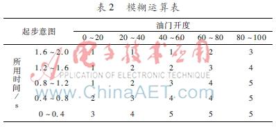 使用单片机进行数据处理时,可以采用查表法来模拟模糊控制的运算过程。将油门开度分为5份:0~20、20~40、40~60、60~80、80~100,分别表示油门开度变化很小、小、中等、大、很大;设定踩下油门的时间最长为2 s,同样将其分为5份:0~0.4 s、0.4~0.8 s、0.8~1.2 s、1.2~1.6 s和1.6~2 s,对应表示所需时间很快、快、中等、慢、很慢;同样将起步意图分为5种情况,用1~5表示很慢、慢、正常、急、很急,如表2所示。
