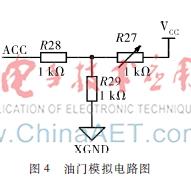 图4油门模拟电路图使用滑动变阻器来模拟油门时,采用电压分压的方法,如图4所示,当滑动变阻器处于最小值时,ACC端电压为5 V,当滑动变阻器为最大值时,ACC端电压为1 V,所以ACC端的电压值为1~5 V,然后经过ADC0832进行A/D转换处理,得到的对应数值为51~255(对应的单片机为8位单片机),51对应的油门开度为0,255对应的油门开度为100,设定呈线性关系,将其转换为函数关系式为: