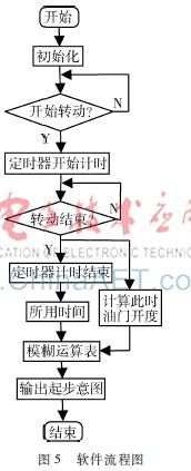 按照系统总体设计的要求, 单片机控制要能做到实时对驾驶员的起步意图作出正确响应。 整个控制系统由信号检测与处理、模糊运算、 结果输出显示3部分组成。首先进行初始化,包括定时器、AD转换,初始化成功后读取油门模拟电路转换的数字电压值,将其代入式(1)中求得数字化的油门开度,同时利用定时器计时功能记录滑动变阻器转动的时间,最后根据查表法完成驾驶员起步意图程度的判定,并且进行输出。软件流程如图5所示。