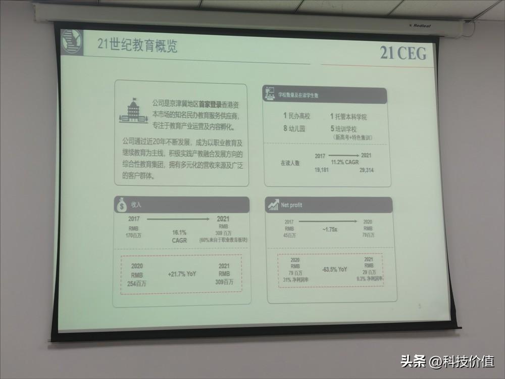 从财报来看,过去5年来(2017-2021年),21世纪教育的收入年均复合增长率可以达到16.1%,即从1.7亿增长至3.1亿(2021年,21世纪教育60%的收入来自于石家庄理工职业学院);利润方面,过去4年,21世纪教育翻了1.75倍,从4500万达到7900万。2021年受到双减政策的影响跌至2900万,跌幅为63.5%。