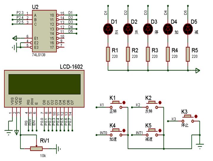 LCD1602的数据/命令选择端、读写选择端、使能信号分别接在单片机的P2.0、P2.1、P2.2口上,数据口接在单片机的P0口上。LCD1602可以显示步进电机的5种运行状态以及运行速度。5位LED通过74LS138接在单片机的P2.3—P2.5口上,5位LD分别用于表示步进电机的正转、反转、加速、减速、停止5种运行状态。