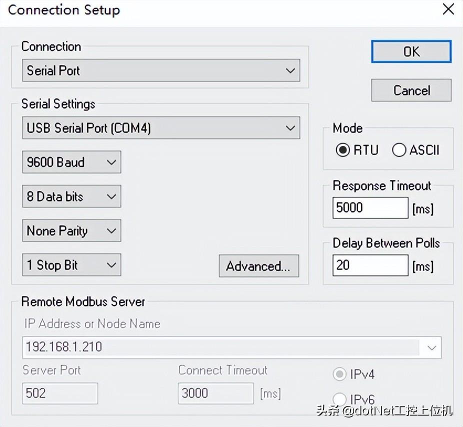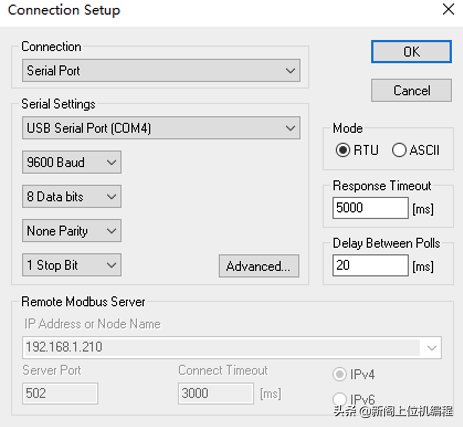 (1)打开ModbusPoll软件,通信参数选择COM4、9600、N、8、1,具体配置如下图所示: