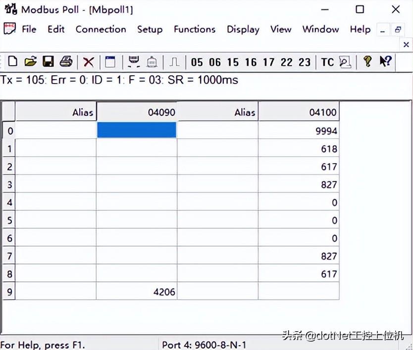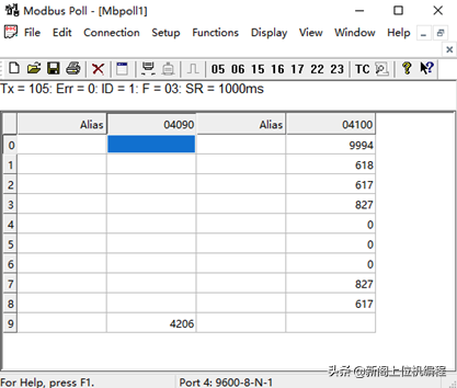 打开ModbusPoll软件,通信参数选择COM4、9600、N、8、1,读取寄存器起始地址为4099,读取长度为10,具体配置如下图所示: