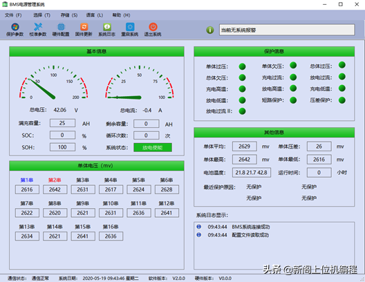 (4)实现读取之后,我们分析一下结果,4099读取到的值为4206,说明当前电池的电压为42.06V。我们可以用实际开发完成的上位机软件做下对比,验证一下数据是否正确: