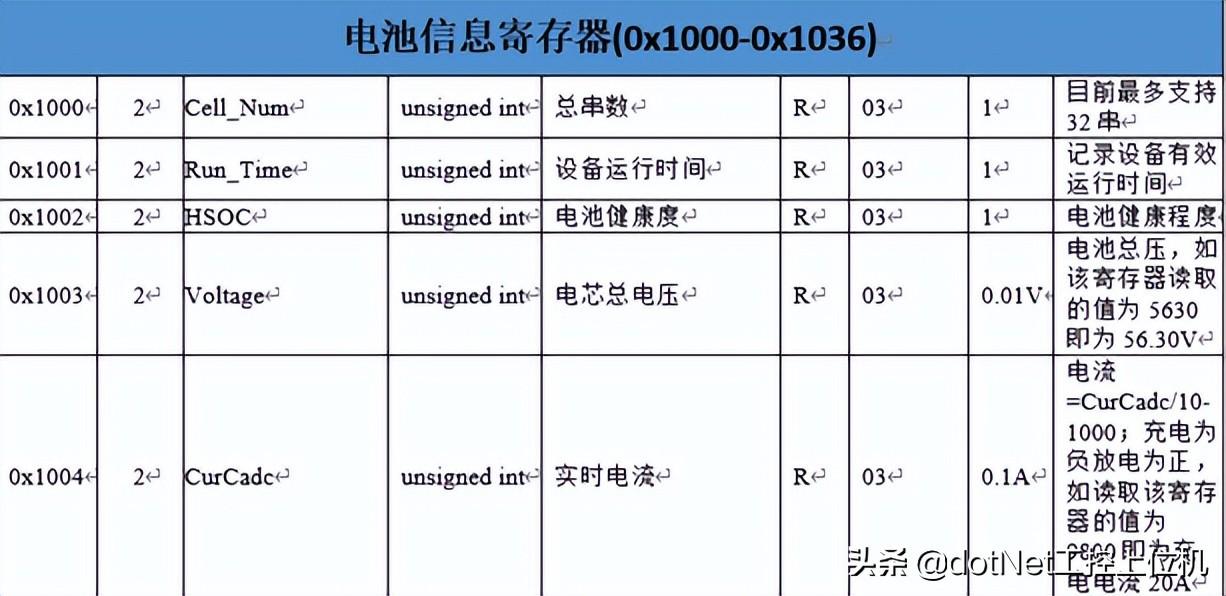 上表中,以电芯总电压为例,Modbus地址为0x1003,对应十进制即为4099,寄存器地址即为44100,读取类型为ushort类型,换算公式为读取之后乘以0.01,比如读取值为5630,即为5.63V。