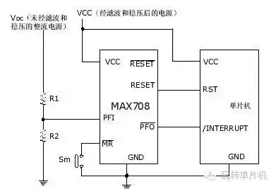 上 电复位,保障上电时能正确地启动系统;掉电复位,当电源失效或电压降到某一电压值以下时,复位系统;市面上有类似的集成产品,如PHILIPS半导体公司 生产的MAX809、MAX810。此类产品体积小、功耗低,而且可选门槛电压。可保障系统在不同的异常条件下可靠地复位,防止系统失控。图8中的Rm和 Sm实现手动复位 无需该功能时可把Reset端(或/Reset)端直接与单片机的RST端(或/RST端)相连 最大限度地简化外围电路 也可选择PHILIPS半导体公司带手动复位功能的产品MAX708。