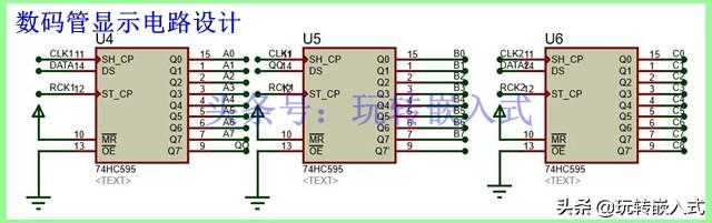 这三颗数码管中,分为时间显示和编号显示两组,用到三颗74HC595,其中两颗级联用于控制时间显示的数码管,总共用到6个单片机的IO口,驱动电路如下图所示。