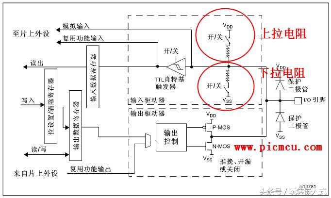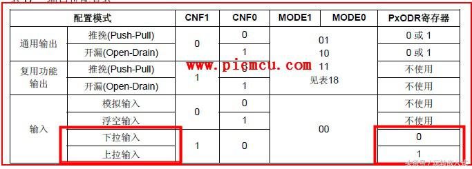 32位的单片机,其GPIO口基本上都配有内部上下拉电阻,通过寄存器控制,可以将某个引脚设置为上下拉模式: