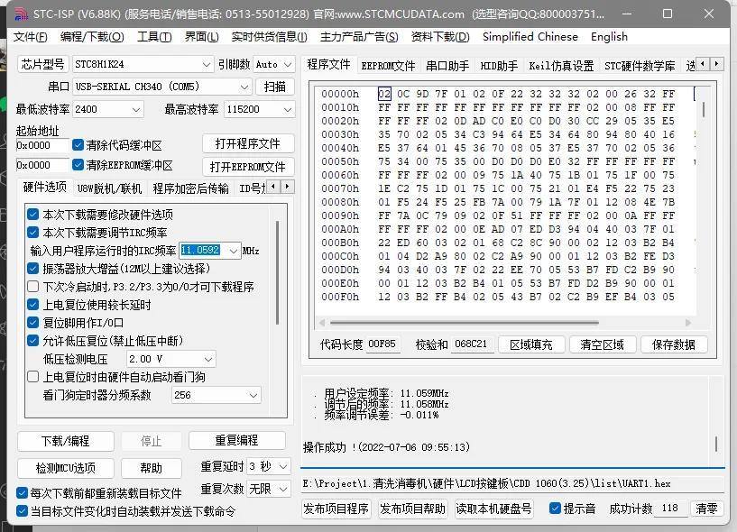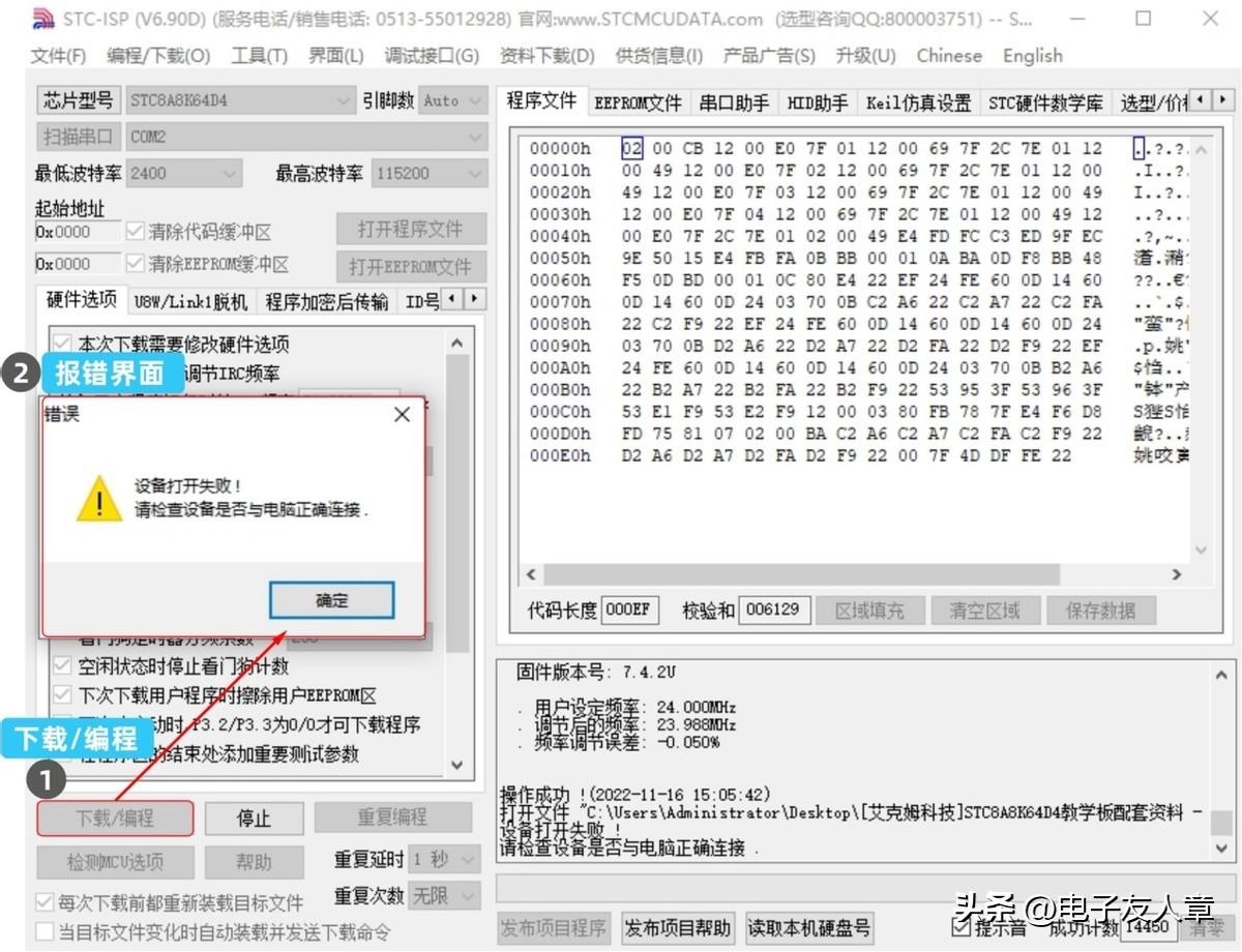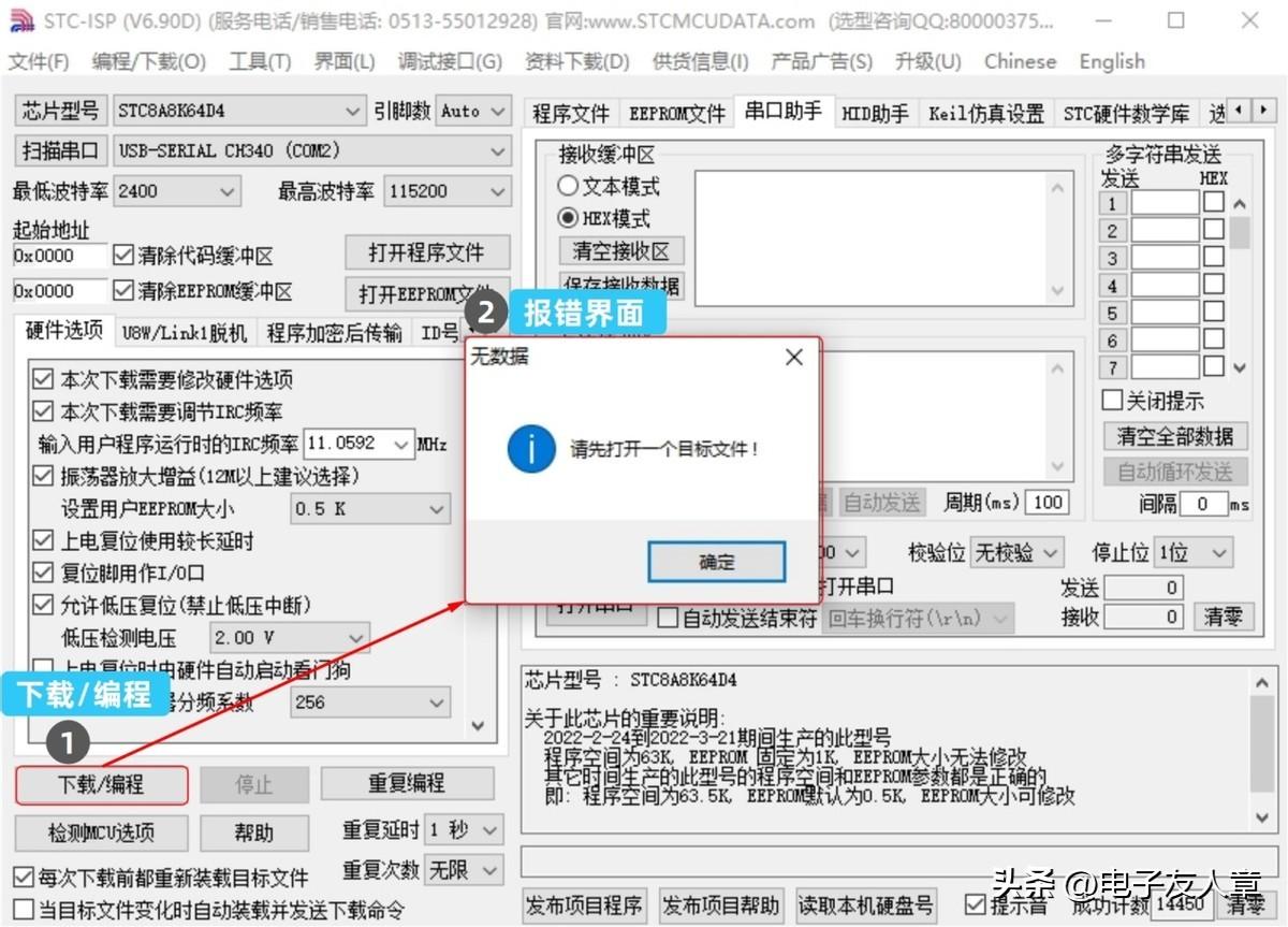 解决方法:重新添加选择单片机型号,务必注意添加新的单片机型号后,要点击“打开程序文件”按钮,将HEX文件重新选中。51单片机USB转TTL一键下载