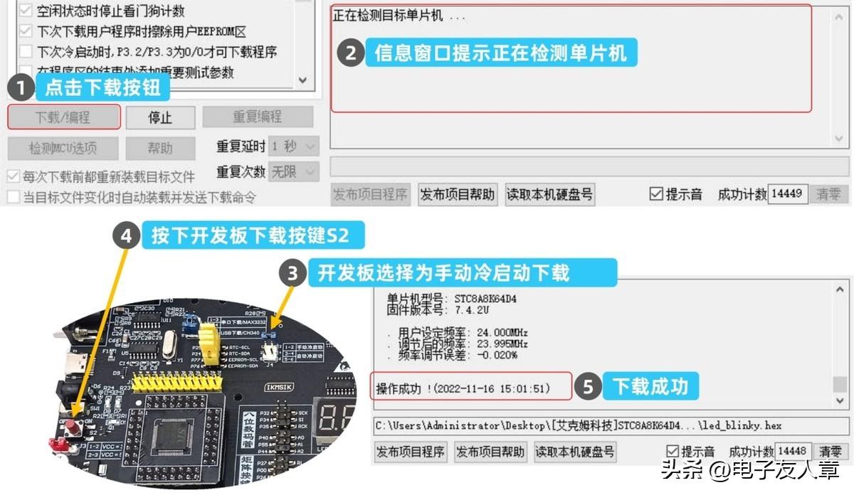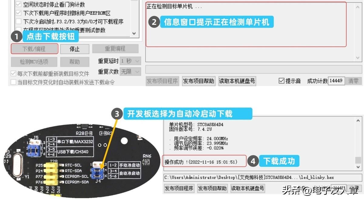 烧写点击STC-ISP软件上的“下载/编程”按钮,点击后,STC-ISP软件开始检测单片机并自动下载程序。下载完成后,信息窗口会提示下载成功与否,如下图所示。(如果开发板J4端子选择为了手动下载,我们需要按一下开发板上的下载按键S2来启动下载)