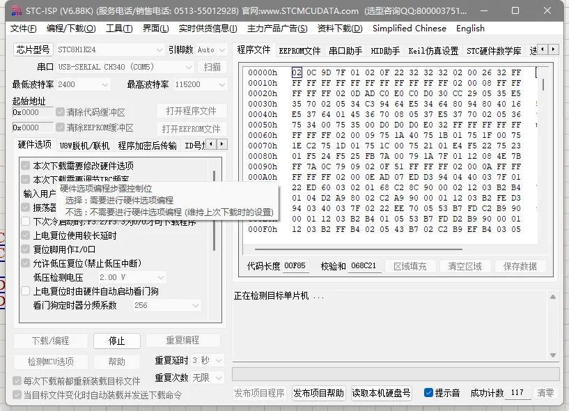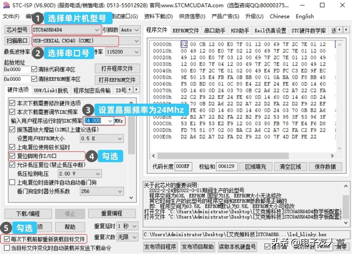 勾选“每次下载前都重新装载目标文件”勾选后,每次点击“下载/编程”按钮,STC-ISP软件会重新读取选定的HEX文件。这一条在开发的过程中一定要勾选,否则,当我们重新编译程序后,生产的HEX文件内容已经改变,但是下载时仍然下载的是STC-ISP软件缓存的HEX文件,而不是重新编译生产的HEX文件。