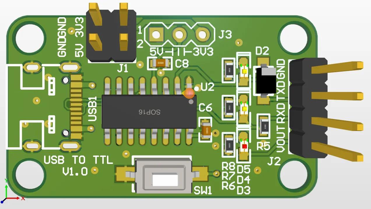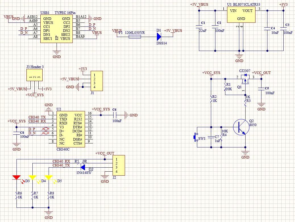 USB转TTL使用了CH340C,接口采用TYPE C 16pin接口,留了一个5V和3.3V的排针及GND。STC8系列功耗很低,这会使USB转TTL的TX连接MCU的RX时使MCU不能完全断电,所以按照STC给出的下载电路添加进去即可。5V转3.3V选用了一款贝岭的LDO。通过短路冒选择输出电压5V或者3.3V。