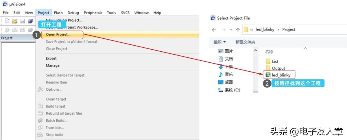 点击Project,然后点击Open Project File,按照路径提示找到,“...\第3部分:配套例程源码\1 - 基础实验程序\实验2-1-3:流水灯(多个c文件)\led_blinky\Project”文件夹中的led_blinky. uvproj文件,操作步骤如下图所示。图3:Keil C51打开工程文件步骤