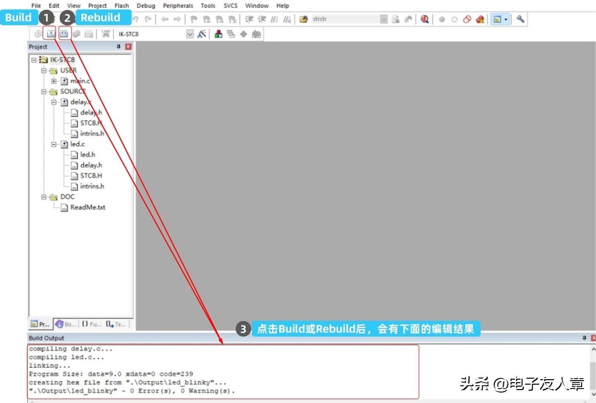 注:HEX文件生成路径设置为:“...\第3部分:配套例程源码\1 - 基础实验程序\实验2-1-3:流水灯(多个c文件)\led_blinky\Project\Output”。完成上述操作之后,回到主界面,按下图所示点击编译按钮生成HEX文件。图6:编译Keil C51