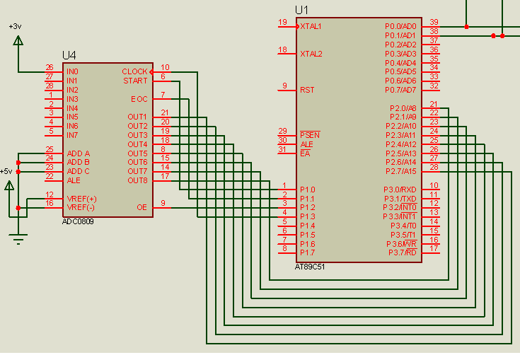 如下图所示,从 ADC0809 的通道 IN3 输入 0-5V 之间的模拟量,通过 ADC0809转换成数字量在数码管上以十进制形成显示出来。ADC0809 的 VREF 接+5V电压。