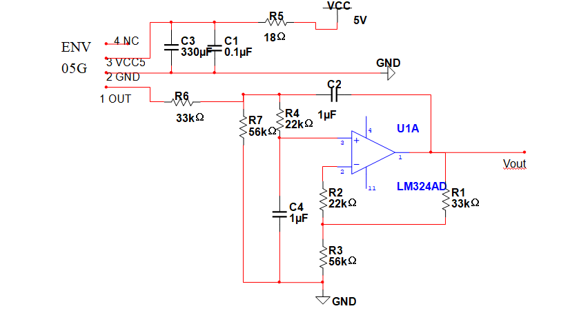 其输出到传感器外围调理电路,是一个由LM324运放组成的二阶压控源RC低通滤波器,信号从同相端输入,具有较高的输入阻抗,放大器的增益为:Auf=1+Rf/R1=1+33k/56k=1.589。输出信号首先经R1,R3分压,分压比为:56/(33+56)=0.629调理电路放大倍数为:0.629*1.589=1,传感器信号调理电路输出即为角度传感器能够输出的角度范围值。设计中将角度传感器放在摆杆上,从静止开始来回旋转,即可得到摆杆的实时角速度值,再通过软件处理输出角度值。