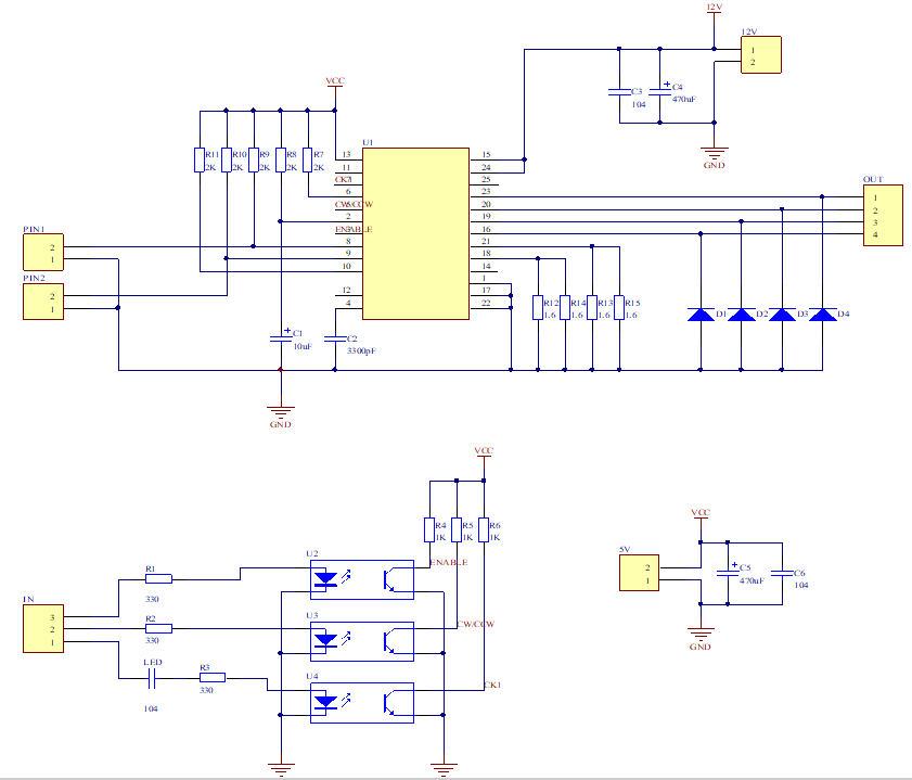 电机选择42BYGHW208型步进电机,此电机是两相四线制,体型较小,力矩可以满足要求。步进电机整步工作情况下,距角为1.8°,所以一个脉冲使电机转动1.8°。单片机电路,AD换后的数字信号交由单片机处理。由θ传=θ电机 ,通过控制步进电机输入脉冲频率控制其转动的角度,即可以基本实现要求,使平板在摆杆一个周期内转一圈,五个周期转五圈,也可以保持电机角度与摆杆角度相等,以此实现基本要求,使平板保持水平,实现硬币不能掉下的任务。