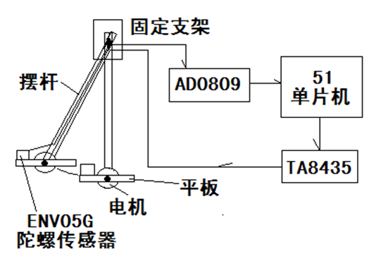 当摆杆移动时,平板的水平位置会发生变化,此信号通过调理电路输入到AD0809转换器,单片机获得摆杆的变化信息,控制TA8435芯片,使摆杆上的电机也作相应的旋转,及时调整平板变化位置,从而使平板基本保持水平的位置。