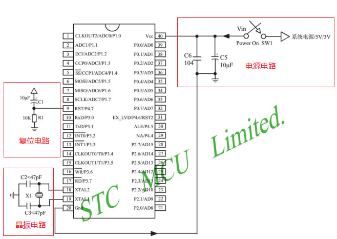 引脚VCC(引脚40)接+5V电源,引脚GND(引脚20)接地线。为提高电路的抗干扰能力,可选择一个0.1μF(器件标注为104)的瓷片电容器和一个10μF的电解电容器跨接在引脚VCC和接电线之间。