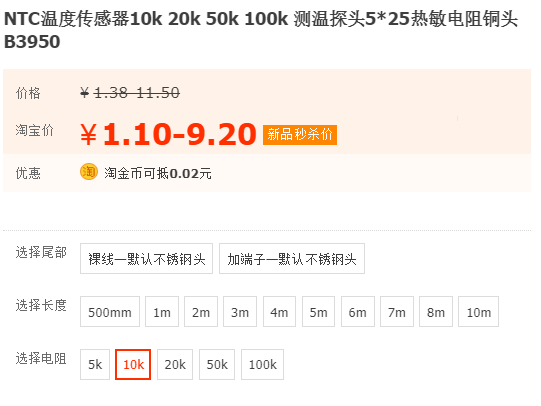 下图是在淘宝上搜索到的一款NTC,按照温度为25℃的电阻取值,可有5KΩ,10 KΩ等不同的规格,而材料系数B值固定为3950。