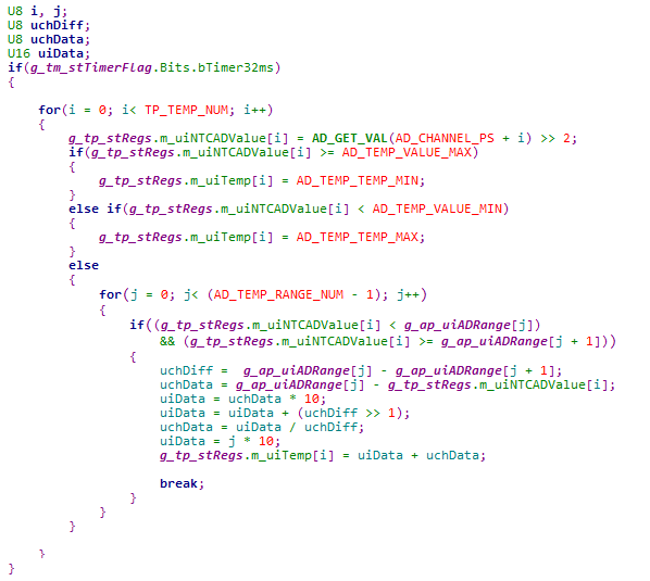 将测温范围分若干个区间,比如在0-100度的范围内,分100个区间,每个区间范围为1℃计算或者实测每一个区间下限和区间上限的温度值; 比如区间30℃-31℃,根据公式1计算或者实际测试出30℃以及31℃的AD值。将这些区间表示为2维数组(这个2维数组也可以通过实际测试形成);取出将AD转换并多次平均之后数值,编历分段的区间,与这些区间的AD上、下限进行比较,判断落在哪一个区间,根据一次函数的公式进行区间内的插值修正:测试温度值=区间温度下限+(区间温度上限-区间温度下限)/(区间AD上限-区间AD下限)*(AD测量值-区间AD下限)