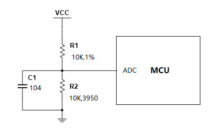 NTC测温核心在于具有ADC功能的MCU,电路比较简单,只需要将固定的电压经过另一个高精度的电阻分压接到NTC电阻,然后将分压值连接到MCU的ADC输入口。