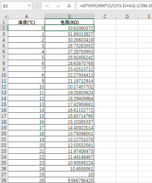 通过excel表格的公式,在excel工作薄的第一列输入温度,第二列输入公式可以得到不同温度下的电阻值,比如0℃为33.6 KΩ