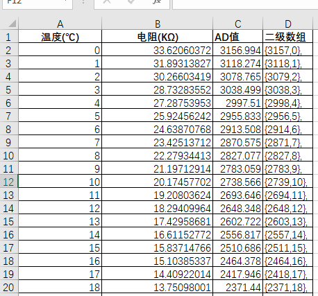 采用excel表格自动生成C语言中包含AD与温度的二维数组