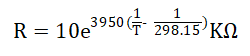 我们选择10K的规格,根据公式1,可以得到这款NTC的电阻与温度的关系为: