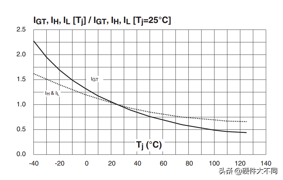 栅极触发电流Igt的设定,应有足够的余量,要充分考虑低温最恶劣的环境,可控硅的结温特性确定了在低温下的Igt需求更大,如下图: