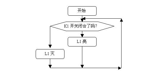 如图4.2.1所示,监视开关K1(接在P3.0端口上),用发光二极管L1(接在单片机P1.0端口上)显示开关状态,如果开关合上,L1亮,开关打开,L1熄灭。