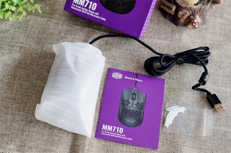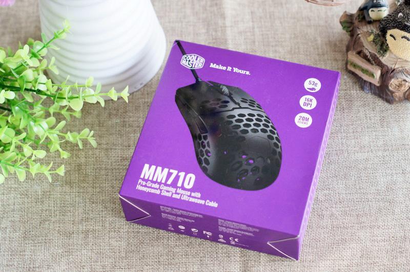 这款鼠标的全称挺长的,叫做酷冷至尊天狼星MM710洞洞鼠标,它的包装是紫色为主题,盒子上印有产品图片,虽然它又两种配色,但包装只印了黑色,我在盒子上没找到颜色标签,不知道它们是怎么区分黑白的。