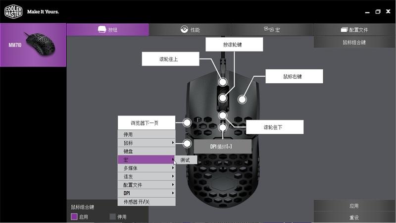 宏命令如何才能生效呢,其实很简单,只要去按钮页面,选中需要使用的按键,把它设置成宏命令的触发键即可。酷冷至尊还支持鼠标组合键功能,这个功能可以让鼠标所有按钮和DPI键进行组合,这就等于可以多出一套按键,可以作为宏命令键使用。
