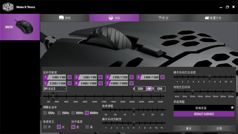 安装成功后,软件会识别你使用的鼠标,来匹配对应的功能界面。从性能页面可以看到这款鼠标的所有可调整的参数。比如七档DPI我习惯只保留1600这一个档位。UBS轮询率(回报率)最高可以达到1000Hz,拥有角度修正和抬升高度功能;还有角度、灵敏度等参数都可以根据需要来调整。